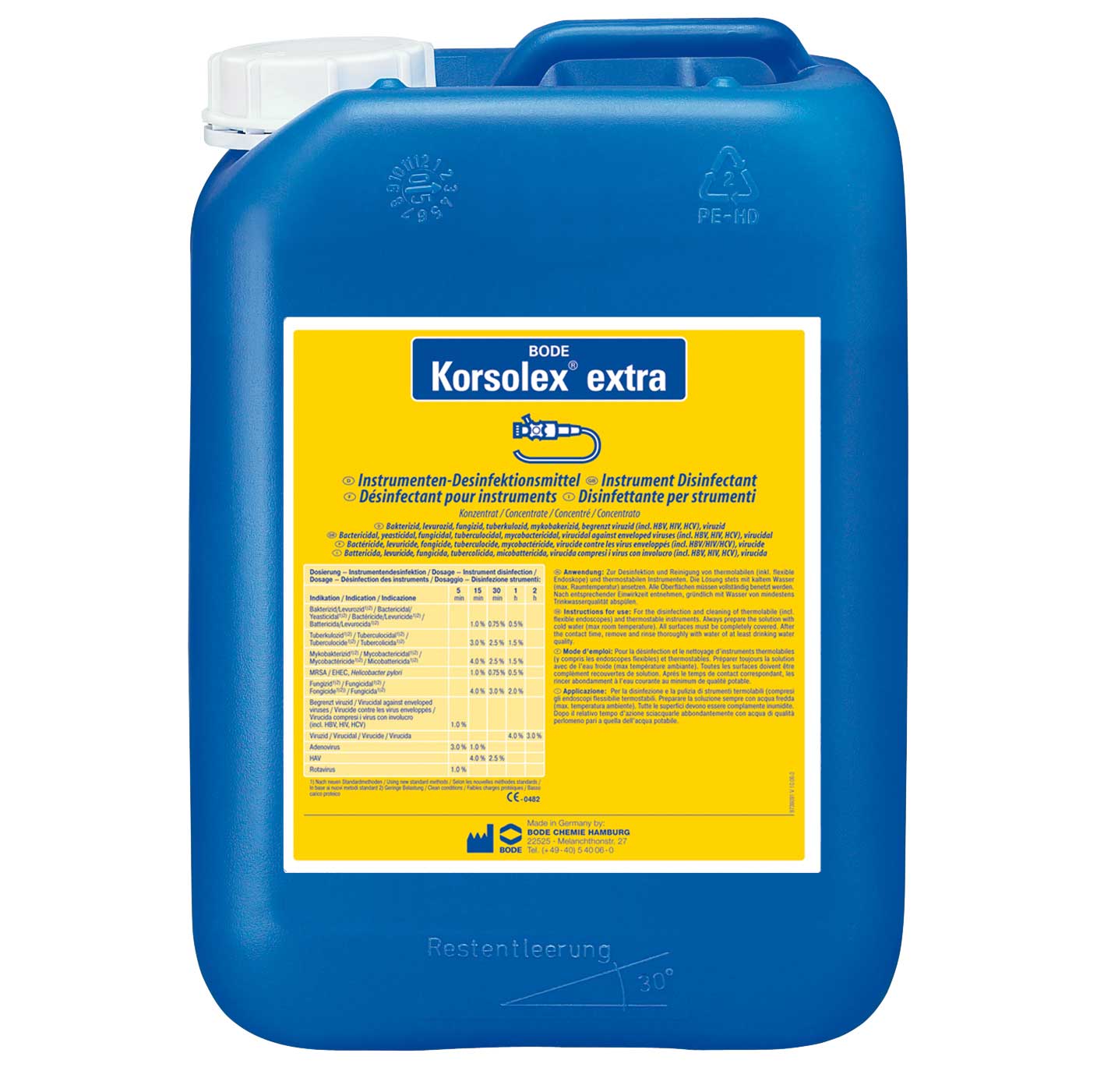 Das aldehydische Desinfektionsmittel für thermolabile und -stabile Instrumente mit viruzider Wirksamkeit inkl. HAV, wirtschaftlichen Einsatzkonzentrationen und hervorragender Materialverträglichkeit. Es ist besonders für jene Bereiche geeignet, die eine kurze Einwirkzeit mit einem breiten Wirkungsspektrum und wirtschaftlichen Einsatzkonzentrationen fordern. Bakterizid, levurozid, fungizid, tuberkulozid, mykobakterizid, begrenzt viruzid (inkl. HBV, HIV, HCV), viruzid (inkl. HAV). Ebenso wirksam gegenüber antibiotikaresistenten Keimen und Helicobacter pylori im Rahmen der VAH-Konzentrationen.