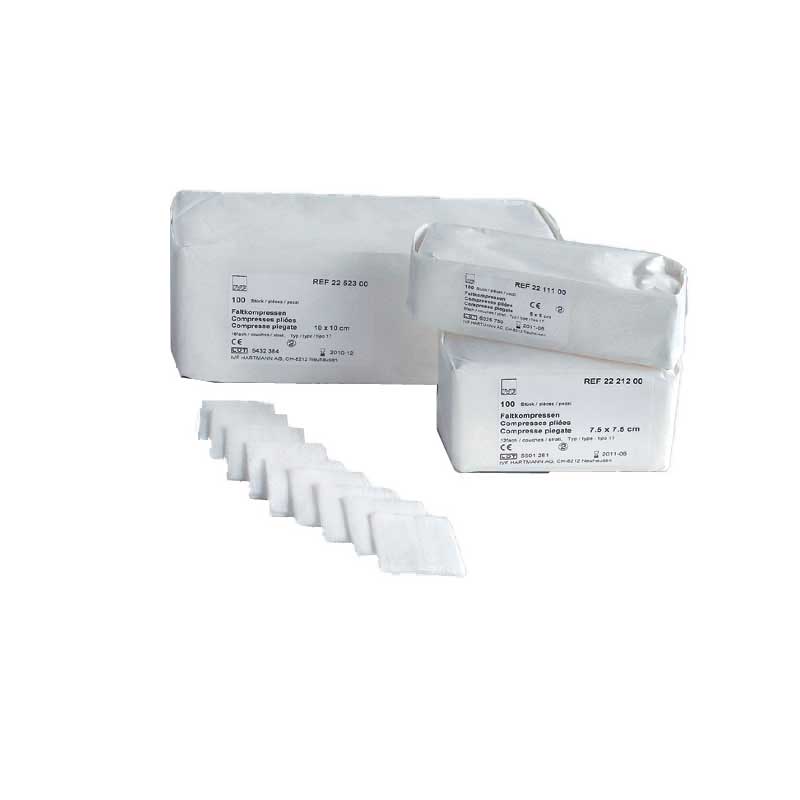 Mehrschichtige Gazekompressen aus 100% Baumwolle, hydrophil, gebleicht. Ränder nach innen gelegt, keine losen Fäden. Sterilisierbare Papierbeutel.
