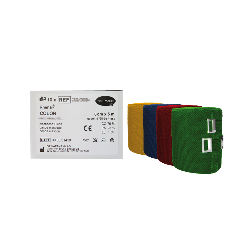 Farbige Mittelzugbinde. In den Farben rot, grün, gelb und blau erhältlich. Geeignet als Stütz- und Halteverband, waschbar. Latexfrei. 76% Baumwolle, 23% Polyamid, 1% Polyurethan.