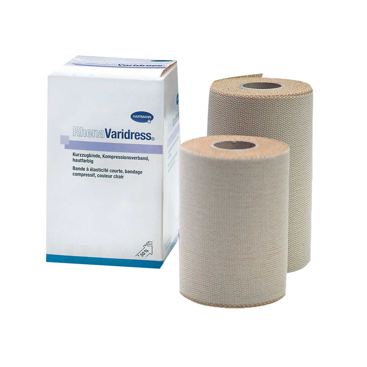 Kompressionsbinde. Kompressionsverband bei Veneninsuffizienz, Lymphödem, Thrombose- und Embolieprophylaxe, waschbar, hautfarbig. Latexfrei. 64% Baumwolle, 36% Polyamid.