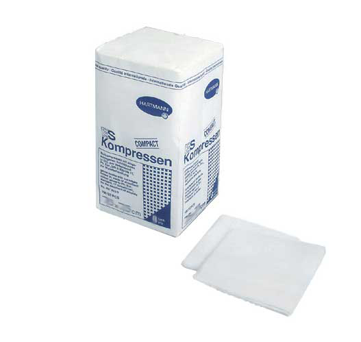 Faltkompressen mit eingeschlagenen Schnittkanten aus 100% Baumwolle, hydrophil, gebleicht. Ränder nach innen gelegt, keine losen Fäden, sterilisierbare Papierbeutel.
