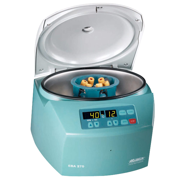 Speziell für die Arztpraxis entwickelte Kleinzentrifuge mit Ausschwingrotor. Die EBA 270 nimmt gebräuchliche Blutabnahmegefäße und Urinröhrchen bis zu einem Volumen von 15 ml auf und beschleunigt sie auf max. 4.000 min-1. Serienmässig mit einem 6-fach Ausschwingrotor ausgestattet. Einsätze für kurze und lange Röhrchen bis 100 mm Länge. Ideal für Gelröhrchen. Die Drehzahl (RPM) wird in 100er Schritten eingegeben. Die Zeit wird in Minuten programmiert. Für ganz kurze Zentrifugationsschritte steht die Impulstaste zur Verfügung.Anzeige des Ist-Zustandes während des Laufes.